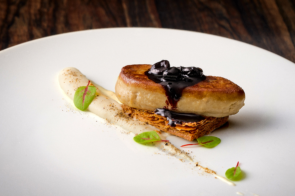 フォアグラの濃厚な味わいに、甘酸っぱいブルーベリーソースと黒胡椒香るマスカルポーネクリーム2種で味わう華やかな一皿。