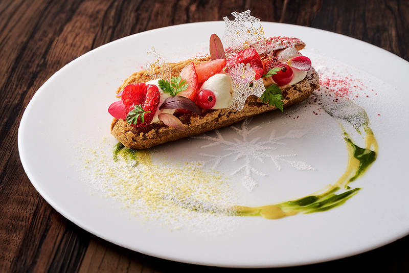 国産発酵バターを使い焼き上げたエクレアに、フランボワーズコンフィチュールとクレームムースリーヌをたっぷりと。