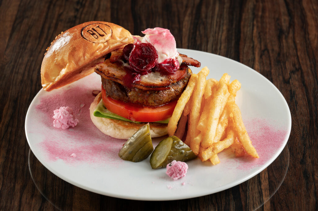 最高級プライムグレード100%ビーフを使用。ステーキと同じく925度の釜で一気に焼き上げ、旨みを閉じ込めたパティに、今年の桜バーガーは、赤ワインを使った甘酸っぱい桜チェリーソースに、ほのかな燻香のスモーキーBBQソース、コクと甘みを添えるハニーマスタードを重ねた奥行きのある仕立てです。