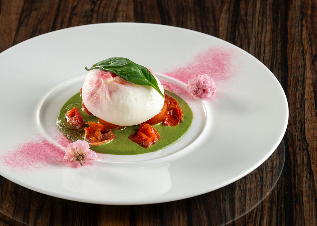 とろけるブラータチーズに、フレッシュミニトマトと、酸味と甘味を凝縮したセミドライトマトの2種を合わせたカプレーゼ。